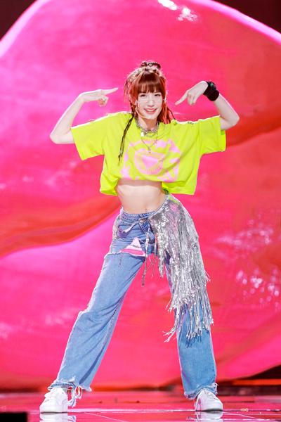 有别于第一次公演的双马尾水手服少女路线、第二次公演的白裙飘飘仙气范儿,朱主爱此次大胆焕新,以金属线条眼镜、荧光色露脐上衣、银色流苏阔腿裤look亮相,变身原宿风街头辣妹。不仅造型亮眼,她动人声线、疯狂踩点的舞蹈动作更是折服了观众,最终以超强的舞台感染力拿下《每天起来唱一遍》小组第一,成为撑腰王。