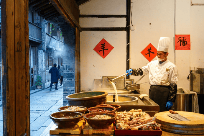 灵水街19号的“泥炉暖锅”承载着木心记忆中的江南味道。这个冬日,它重启乌镇传统泥炉烹饪技艺,推出“回味”木心先生记忆套餐,套餐以木心的经典著作为灵感源泉,精心复刻笔下美食,让游客仿佛穿越时空,感受到木心先生笔下江南美食的精致与细腻。此外,新增的特色芝士鸡肉锅,巧妙融合传统与现代口味,满足年轻游客的多元需求,让传统与现代在舌尖上碰撞出独特的火花。